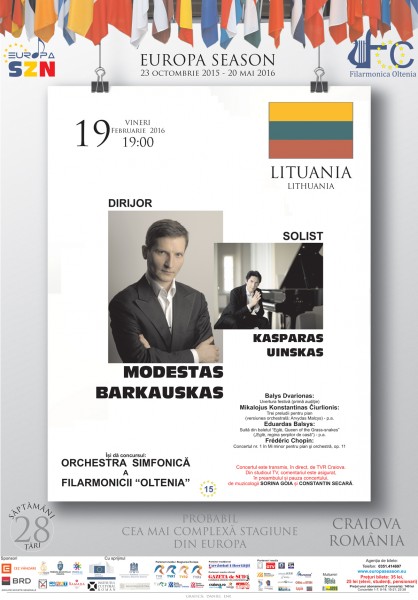 Acesta îi aduce pe scenă pe unul din cei mai apreciaÅ£i tineri dirijori din Vilnius,Modestas Barkauskas –director artistic ÅŸi dirijor al Orchestrei de Tineret „Balys Dvarionas” din capitala Lituaniei, ÅŸi pe reputatul pianist Kasparas Uinskas. Un bilet pentru concert costă 35 lei, cu reducere la 25 lei pentru elevi, studenÅ£i ÅŸi pensionari.