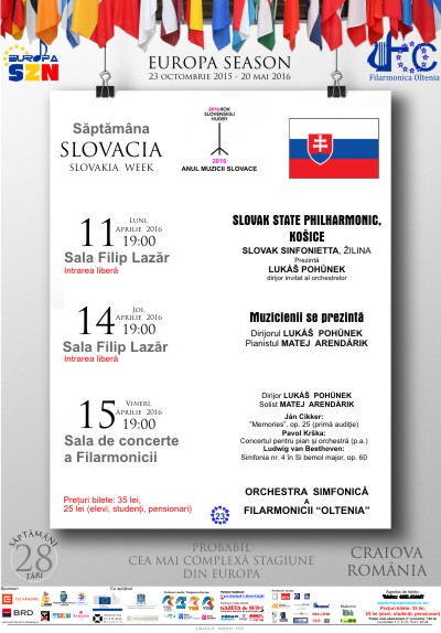 Filarmonica „Olteniaâ€, aduce în perioada 11 – 15 aprilie, în Stagiunea „Europaâ€, tineri muzicieni din Slovacia. Dirijorul Lukáš Pohůnek, la vârsta de 27 de ani, È™i-a construit deja o carieră internaÈ›ională È™i a dirijat mai multe orchestre de vârf. A colaborat cu Symphony New York ÅŸi Leipziger Symphonieorchester ÅŸi este dirijor invitat al Orchestrelor Slovak State Philharmonic – KoÅ¡ice ÅŸi Slovak Sinfonietta – Žilina.