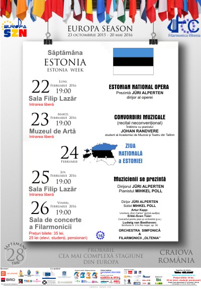 Estonia, cea de 16- ţară invitată în Stagiunea Europa, aduce la Craiova doi tineri pianişti - pe Mihkel Poll, muzician original, complex, cu o tehnică perfectă şi o interpretare plină de lirism şi sensibilitate şi pe Johan Randvere, student al Academiei de Muzică şi Teatru din Tallinn