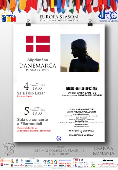 Mezzosoprana ANDREA PELLEGRINI, alături de simfonicul craiovean, va da viaţă creaÅ£iei lui Gustav Mahler, „Kindertotenlieder”, concertul de vineri seara încheindu-se cu „Simfonia fantastică” de Berlioz. Melomanii interesaÅ£i să afle mai multe despre muzica din patria poveÅŸtilor lui Andersen sunt invitaÅ£i joi seara la întâlnirea cu dirijoarea MARIA BADSTUE ÅŸi solista ANDREA PELLEGRINI.
