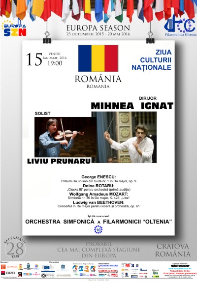 Săptămâna României se încheie cu un concert care are loc chiar de Ziua Culturii NaÈ›ionale. Orchestra Simfonică a Filarmonicii ”Oltenia”, dirijată de Mihnea Ignat, È™i violonistul Liviu Prunaru prezintă un program din creaÈ›ia compozitorilor Enescu, Mozart È™i Beethoven. În primă audiÈ›ie va fi interpretată lucrarea ”Clocks III” de Doina Rotaru. PreÈ›ul biletelor este de 35 de lei (preÈ› întreg) È™i 25 lei (preÈ› redus, pentru elevi, studenÈ›i, pensionari).